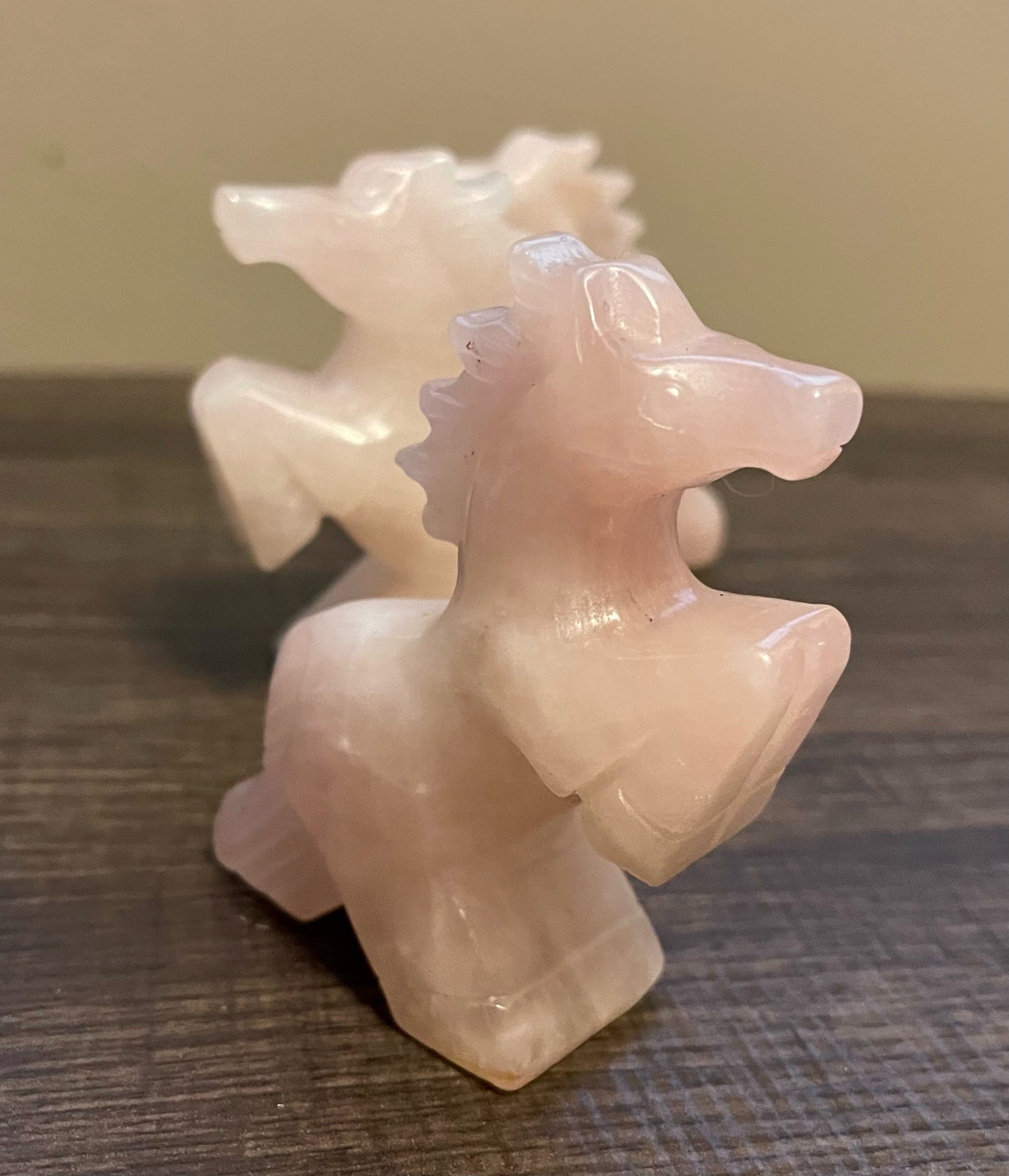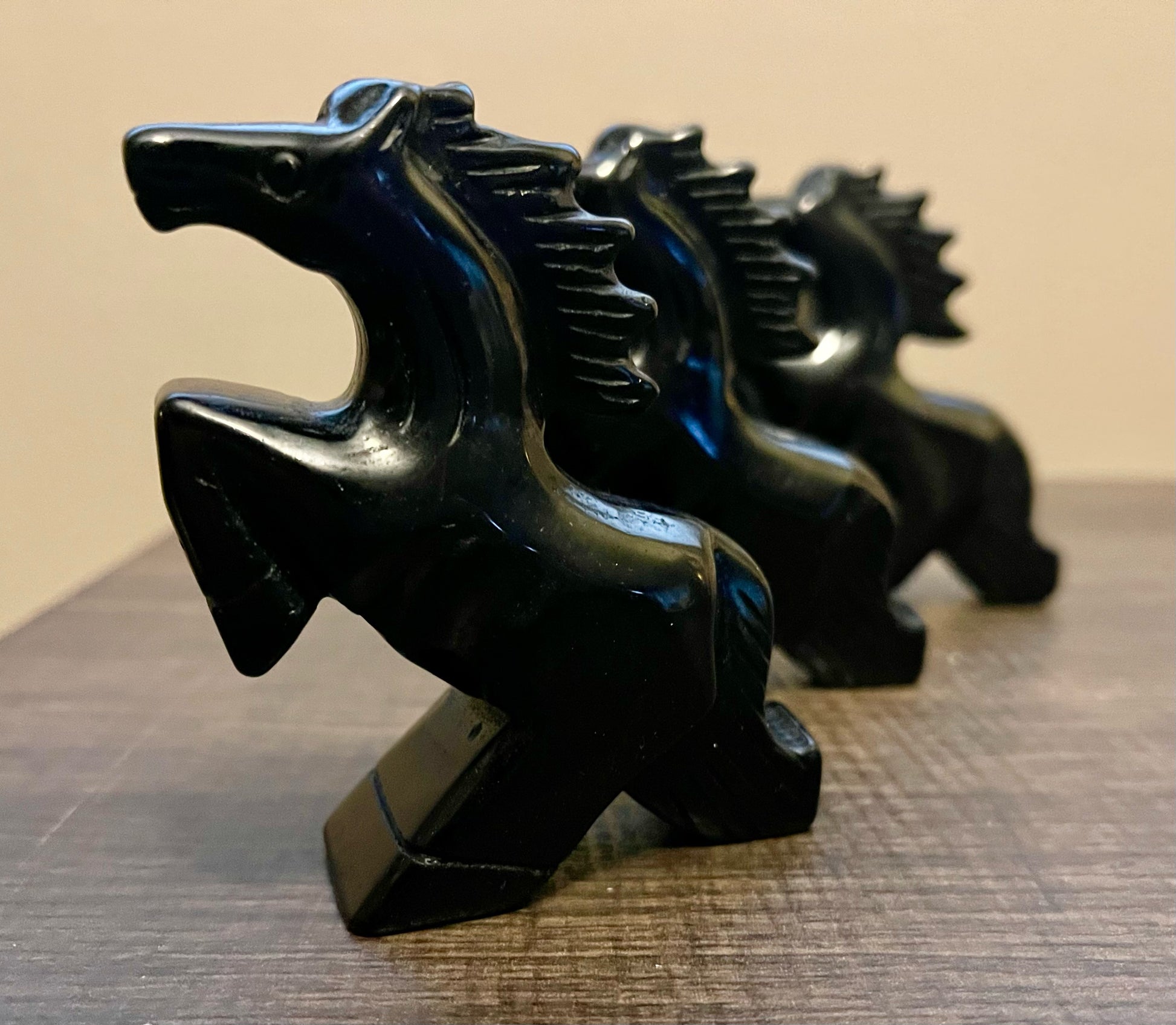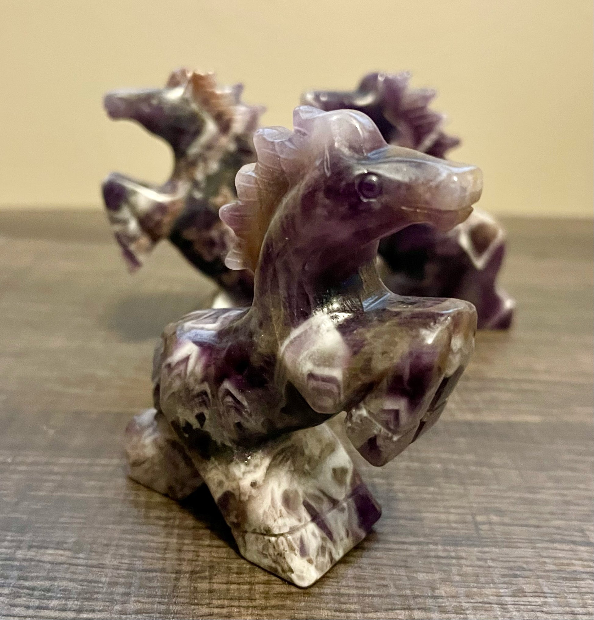 These hand carved horses stand 3.5" high. Horse measures 4" tail to nose. Comes in 4 different stone styles" Amethyst, Rose Quartz, Obsidian and Clear Quartz.