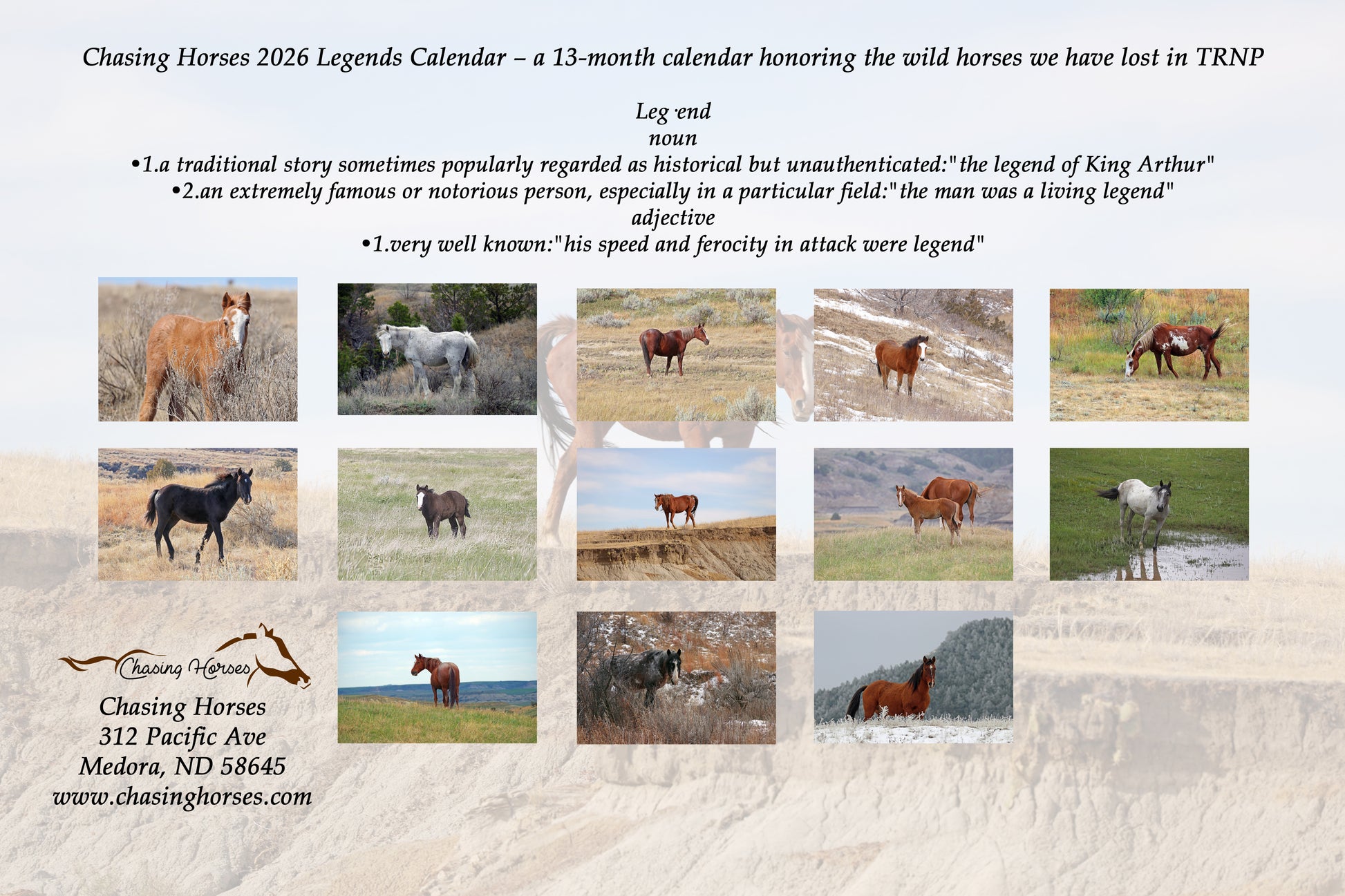 This year, we have 3 different Chasing Horses Calendars for you! America's 250th! Which features different TRNP wild horses with patriotic backgrounds! Legends of Theodore Roosevelt National Park which pays tribute to some of the amazing wild horses who continue to run with us in spirit and our 3rd calendar is the Horses and Landscapes calendar which highlights the beautiful landscapes of TRNP that are enhanced by the wild horses!