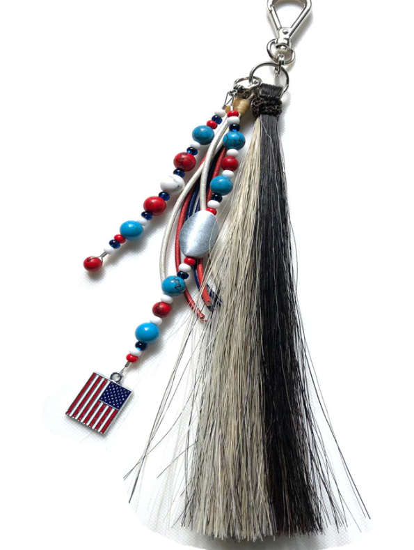 Freedom is in the bag. The flag charm compliments a two-tone tassel of horse hair, with red, white and blue beads. 7.5 inches long includes a sturdy swivel hook attachment. Works great as a key chain too!