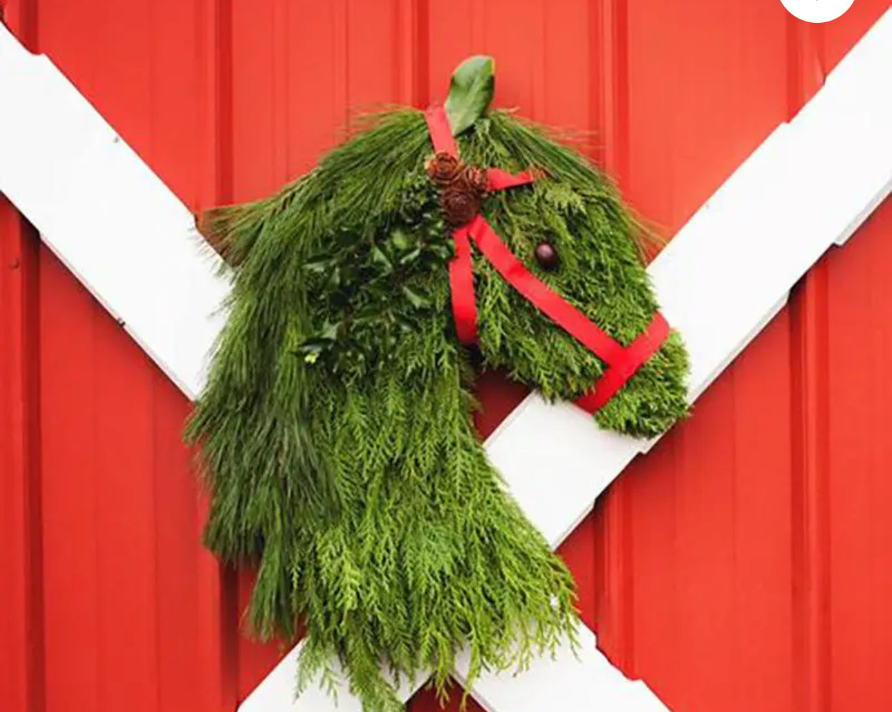 Just in time for Christmas! This beautiful Horse Head Shaped Christmas wreath measures 15" high x 12" wide! Since it is an artificial wreath, it can withstand any weather and be used year after year!