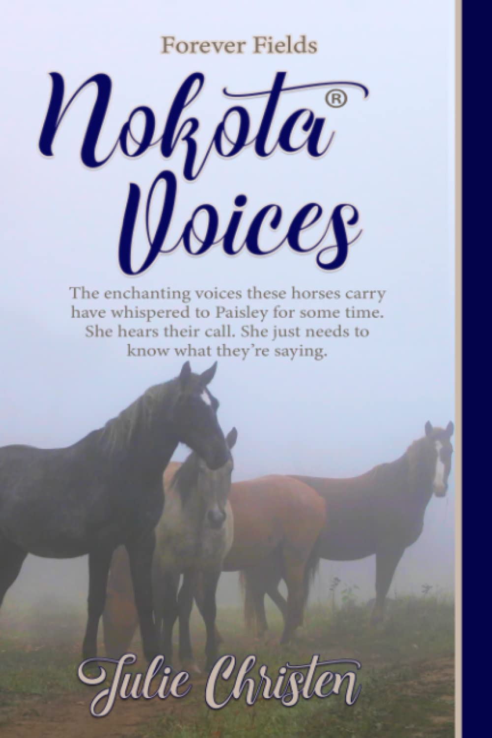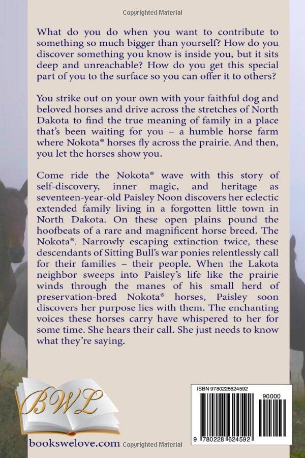 Come ride the Nokota® wave with this story of self-discovery, inner magic, and heritage as seventeen-year-old Paisley Noon discovers her eclectic extended family living in a forgotten little town in North Dakota. On these open plains pound the hoofbeats of a rare and magnificent horse breed. The Nokota®. Narrowly escaping extinction twice, these descendants of Sitting Bull’s war ponies relentlessly call for their families – their people. When the Lakota neighbor sweeps into Paisley’s life like the prairie winds through the manes of his small herd of preservation-bred Nokota® horses, Paisley soon discovers her purpose lies with them. The enchanting voices these horses carry have whispered to her for some time. She hears their call. She just needs to know what they’re saying.